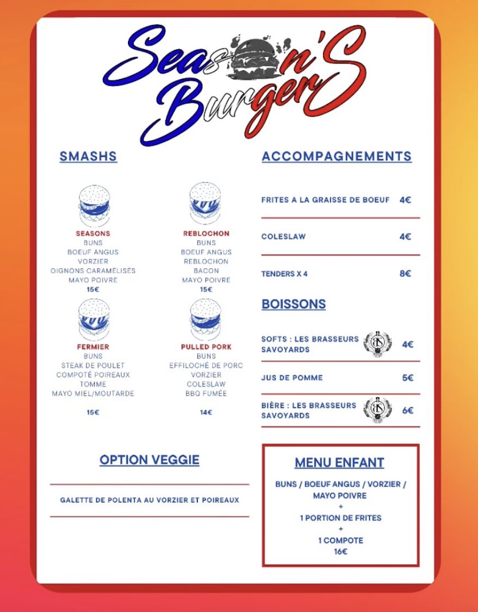 Welcome to Season's Burgers, your go-to fast-food haven located at 270 Rte de Viaison in Reignier-Ésery, France. This culinary gem shines through its commitment to quality and local ingredients, evident in each handcrafted burger. The menu boasts mouthwatering options like the Reblochon Smash Burger and the Pulled Pork Bun, each accompanied by rich flavors and textures, from gooey cheese to smoky BBQ sauce.